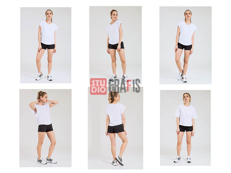 18 mockup tshirt/kaos cewek, untuk promosi kaos. Mudah ganti gambar/design dengan Photoshop. High resolution 3746 x 5819 pixel. File yang akan kamu dapatkan: 18 PSD & 18 JPG.