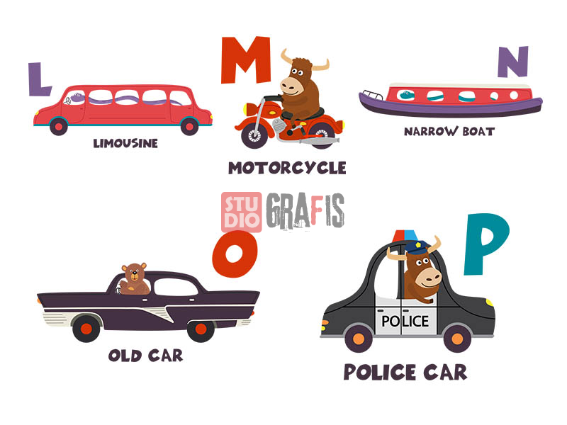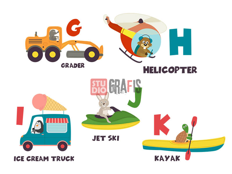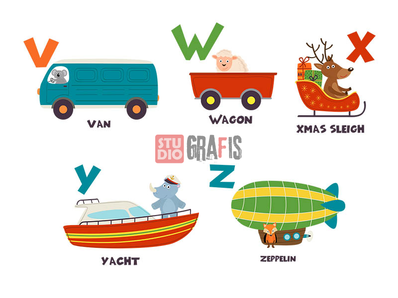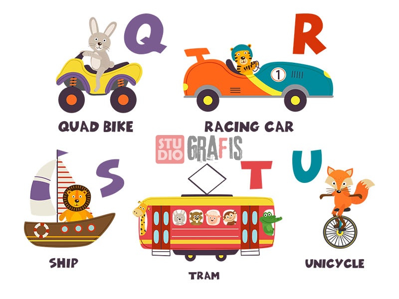 26 gambar lucu cocok untuk anak-anak sekolah, playgroup, tk belajar alfabet. Bertema alat transportasi & hewan. Format gambar PNG transparan. Semua gambar disimpan dalam file berbeda, jadi total ada 26 file PNG.