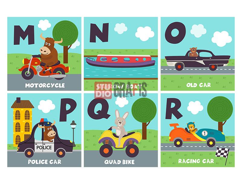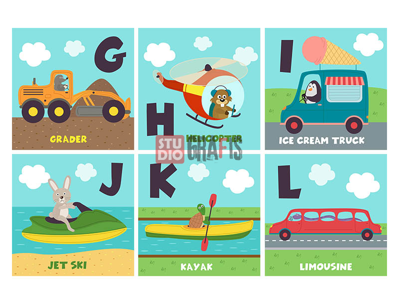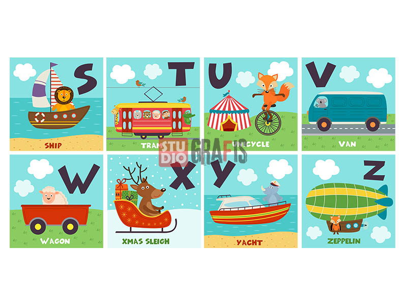 26 gambar ilustrasi bertema alat transportasi untuk pembelajaran afabet bahasa Inggris untuk anak sekolah, playgroup, TK. Cocok juga untuk printing media pembelajaran, alat peraga, hiasan dinding, buku dll. Tersedia dalam format vektor AI & EPS, juga JPG resolusi tinggi 4167 x 4167 pixel siap untuk print hingga ukuran super besar.