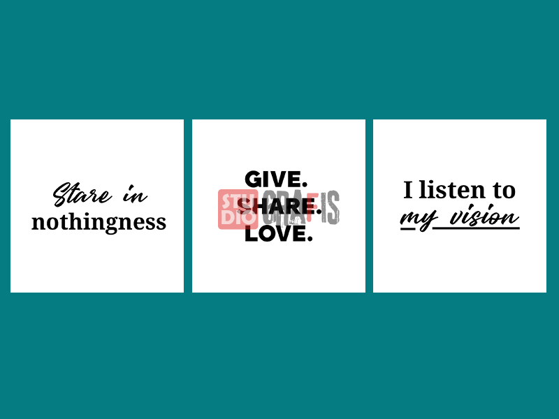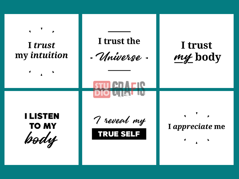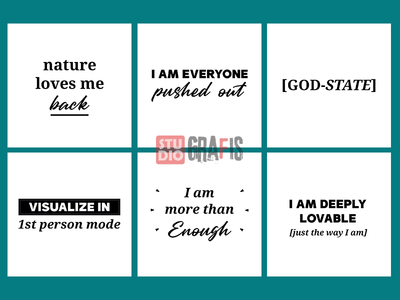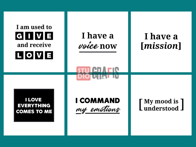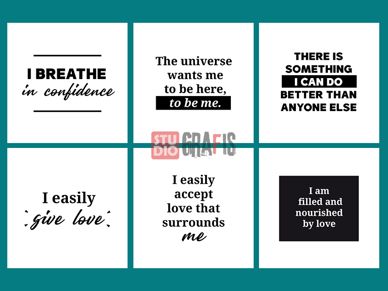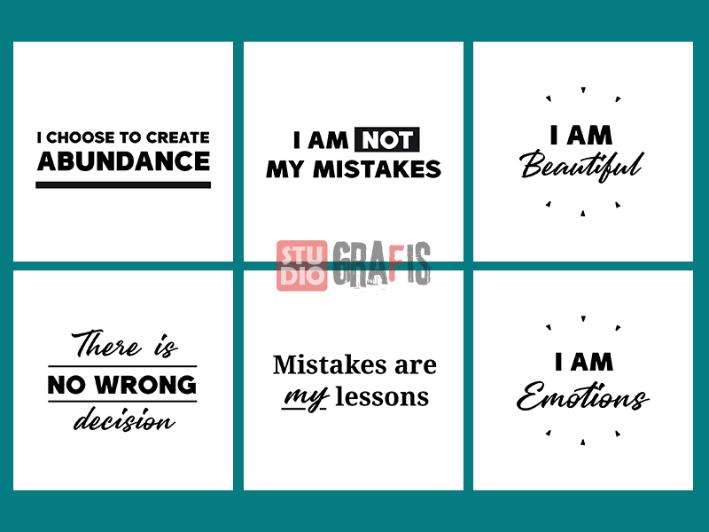 63 desain simple tapi keren berisi kutipan kata-kata motivasi diri, cocok untuk printing kaos/tshirt, status WA, posting Facebook & Instagram, hiasan dinding, foto frame, tote bag, cover, album, foto kolase, kantung belanja, kartu ucapan, cetak mug dan digital printing lainnya.
