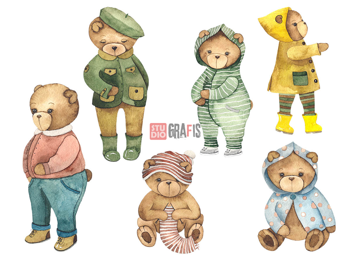 Bundle lebih dari 50 gambar watercolor bertema beruang. Semua gambar disimpan dalam file terpisah dengan format PNG transaparan resolusi tinggi, sehingga bisa dikombinasikan untuk membuat komposisi kolase baru.
